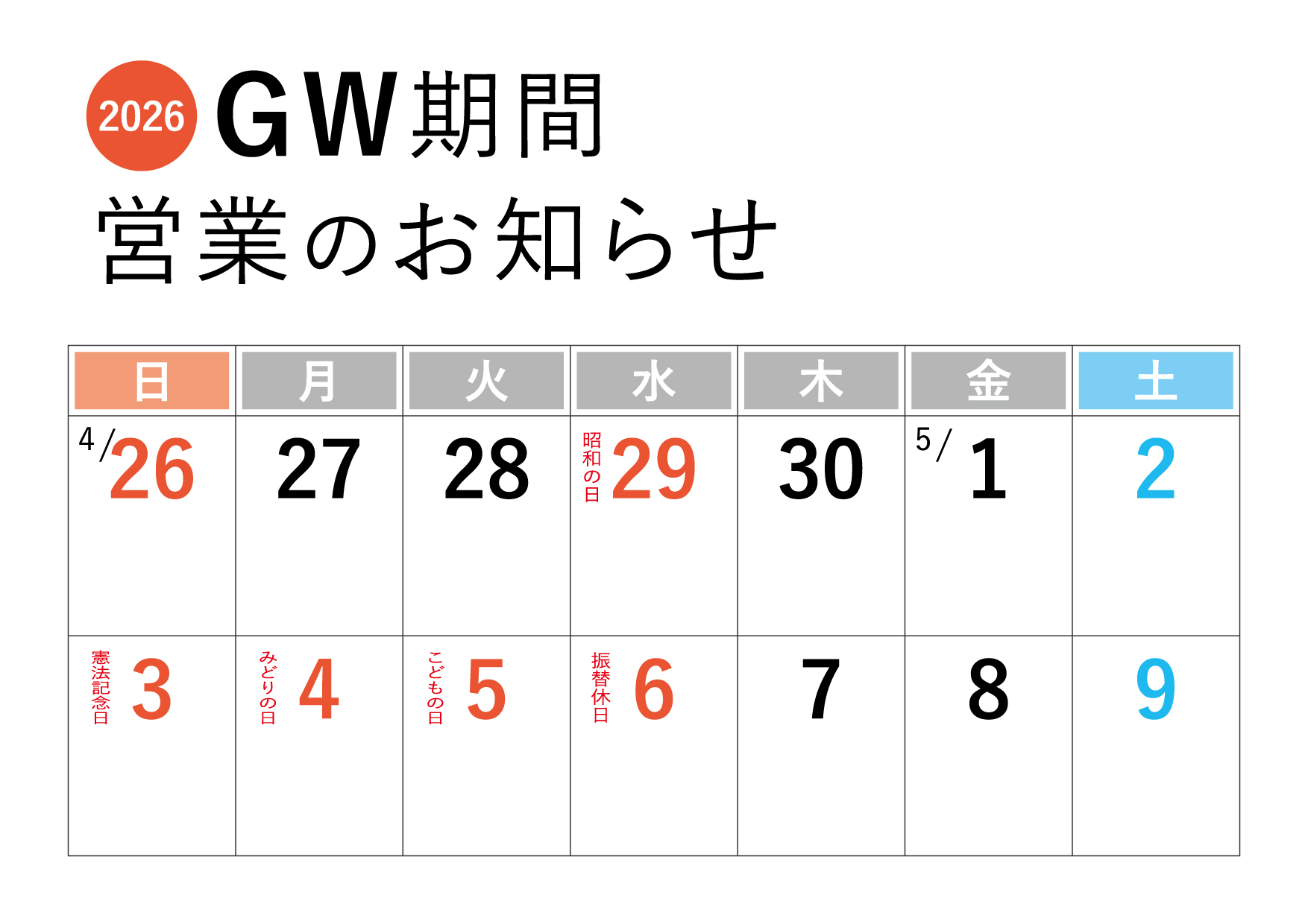 4月29日(祝) お休み 4月30日➡~5月2日 平常通り営業 5月 3日➡~5月6日 お休み 5月 7日 平常通り営業